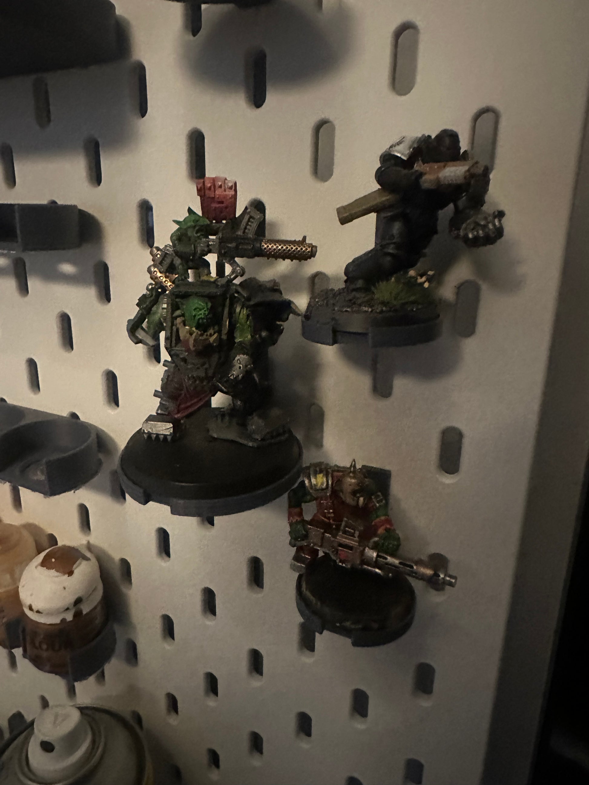 Each holder supports standard round miniature bases and mounts vertically on the board using the supplied peg, allowing finished models or works-in-progress to be stored neatly while staying accessible. Suitable for painters, collectors, and tabletop gamers looking to save desk space while keeping models visible.