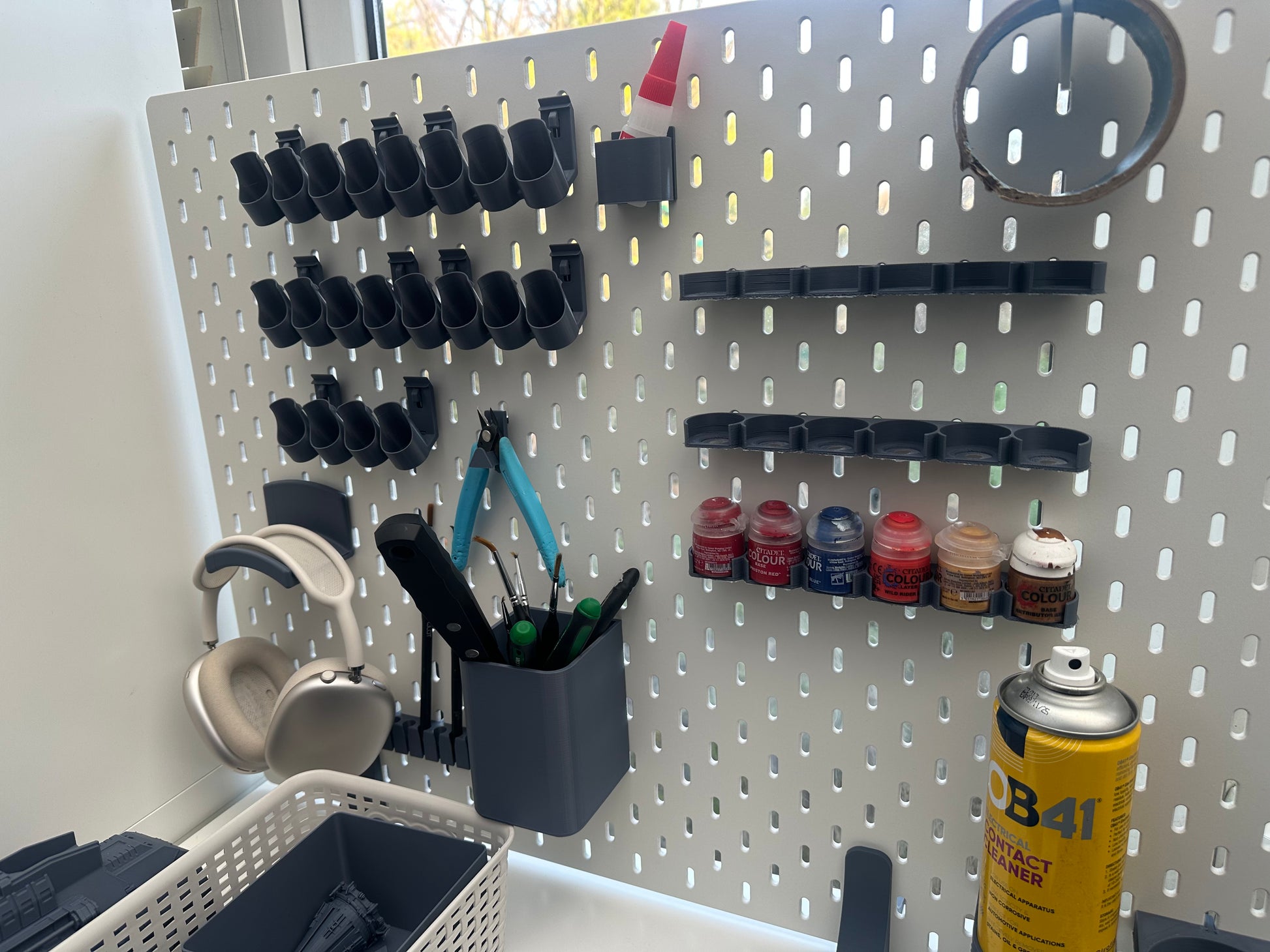 Ideal for miniature painters, model builders, and tabletop hobbyists looking to build a clean, functional wall or desktop setup.